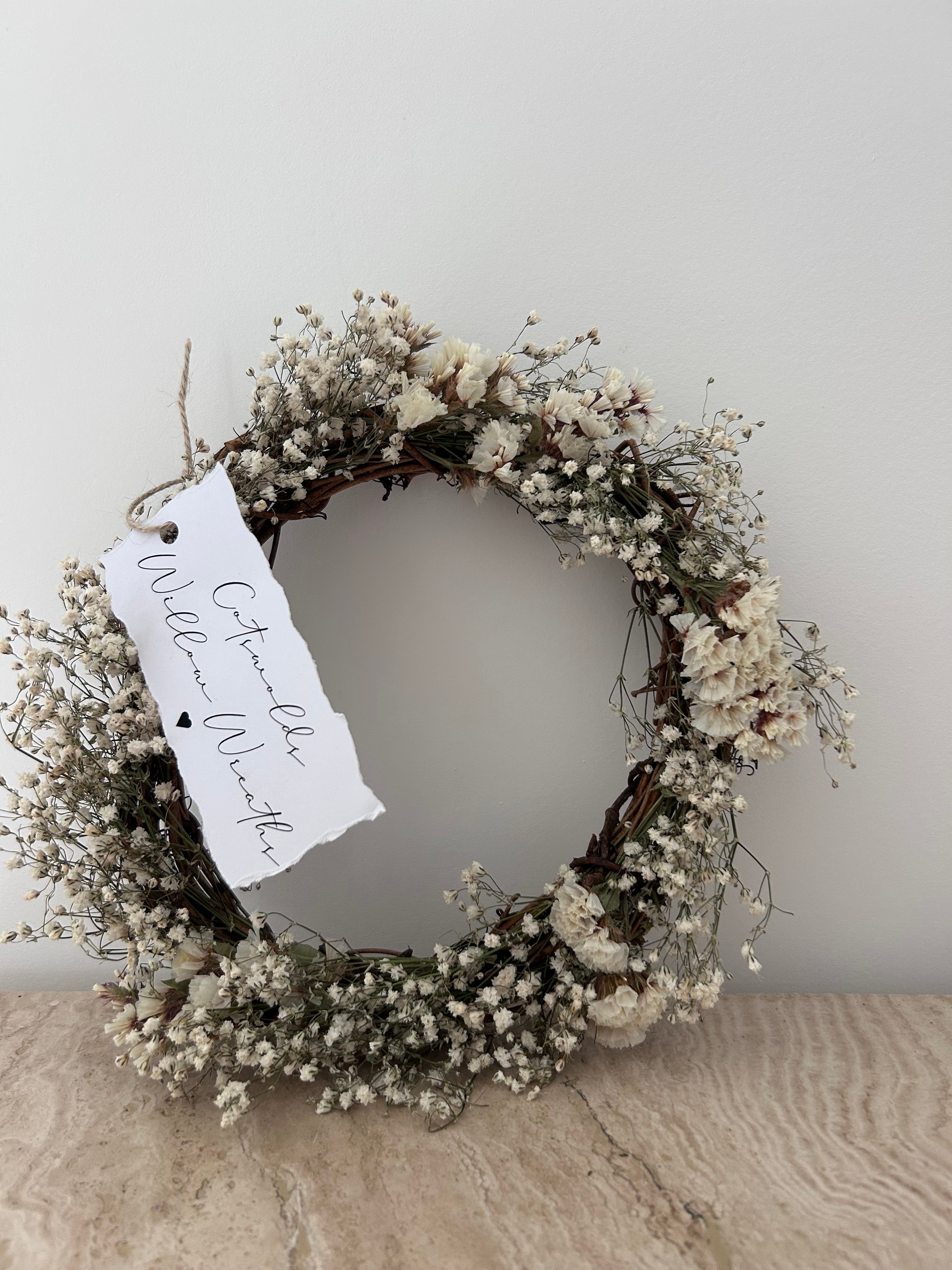 Cotswolds Willow Wreaths are made with Gypsophila’s and Daisies, we also do other designs with Gypsophila’s and different flowers, please take a look at our menu page for all our wreaths designs